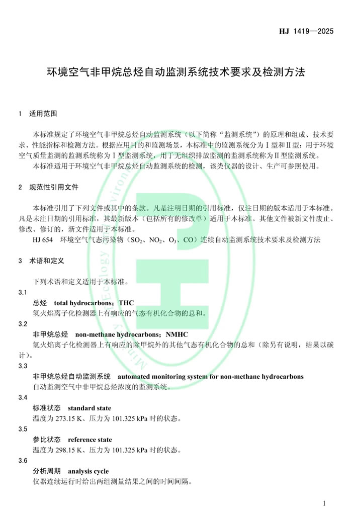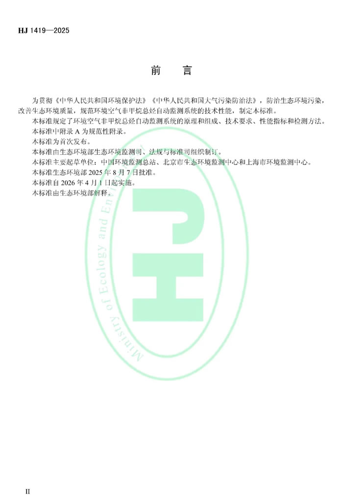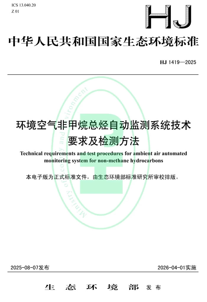 為貫徹《中華人民共和國環境保護法》《中華人民共和國大氣污染防治法》,防治生態環境污染,改善生態環境質量,規范環境空氣非甲烷總烴自動監測系統的技術性能,生態環境部制定國家生態環境標準《環境空氣非甲烷總烴自動監測系統技術要求及檢測方法(HJ 1419—2025)》。本標準為首次發布,自2026年4月1日起實施。